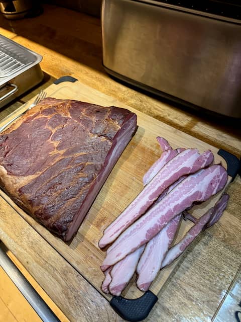I prepped the cure and spice mix. A week of curing, flipping the pork belly in its brine every night. Four hours of smoking. Then slicing it all by hand.