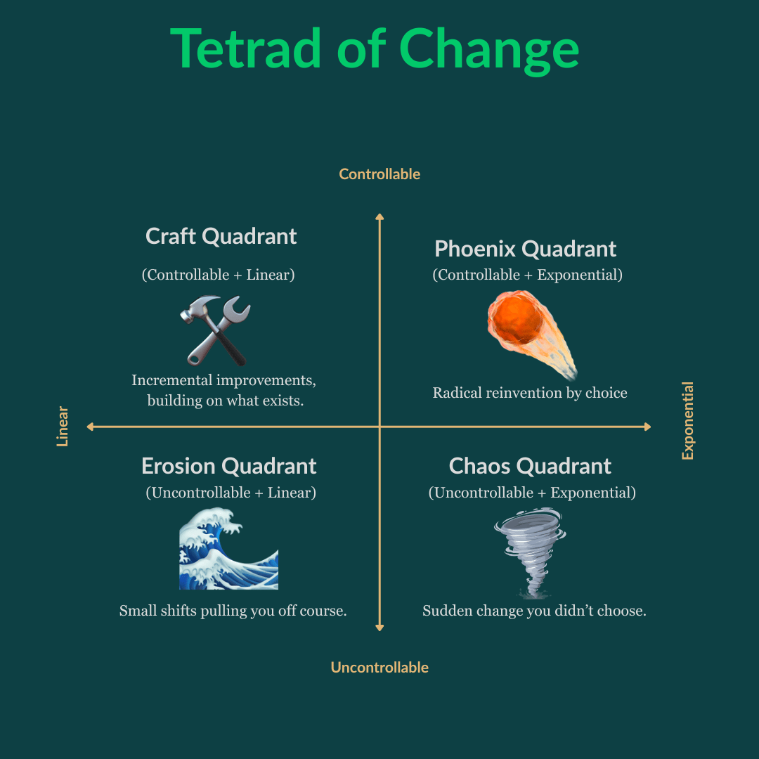 That’s why I created the Tetrad of Change – a mythic-sounding mental model built for clarity, agency, and soul-level reinvention. Because if you don’t know where you are on this map, you’re either wasting energy or getting steamrolled.